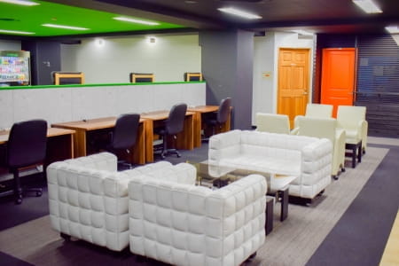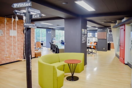 受付前には遊び心があふれるブランコやソファーもあり、その奥には休憩スペースもご用意してあります。息抜きに自由ご利用いただけます。