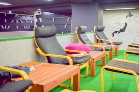 靴を脱いで足を投げ出しながらリラックスできる場所、ぼーっとするものあり、パソコンで作業をここでするのもありです!リラックスするとアイディアも湧いてきそう!